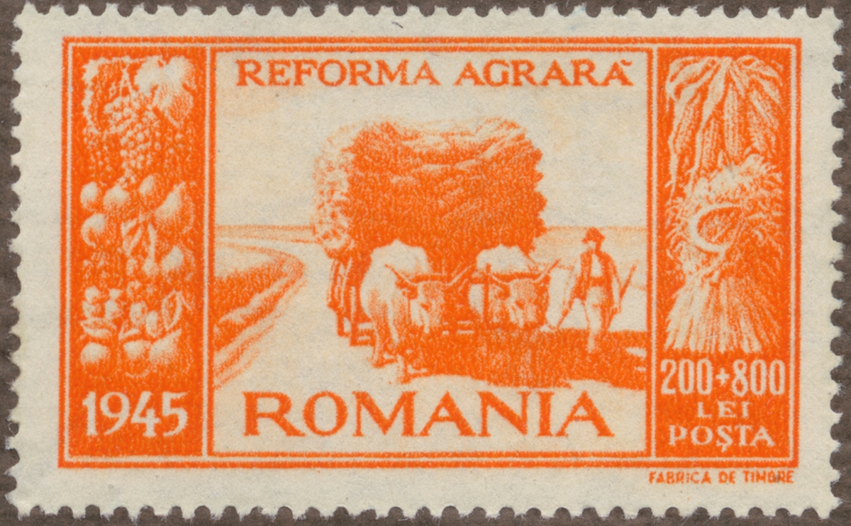 Frimärke från Rumänien, 1945. Motiv av Skördelass draget av oxar Sädeskärve. Majskolvar. Vindruvor. Päron. Fikon. -Minne av Agrarreformen av 23 mars 1945-
