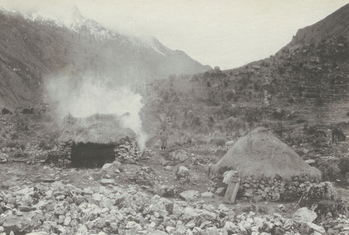 Fotografi från kuvert märkt med "Ernst Nordenskjöld". Motiv av två stenhyddor med halmtak i ett bergslandskap.