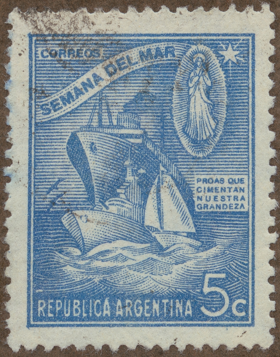 Frimärke från Argentina, 1944. Motiv av 3 olika båttyper: Handelsfartyg krigsskepp segelbåt Sjöfartsveckan