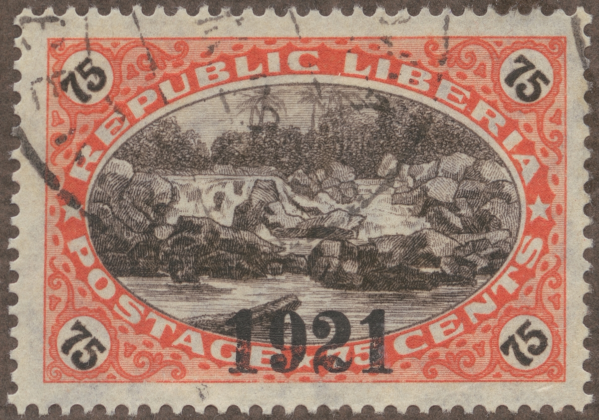 Frimärke ur Gösta Bodmans filatelistiska motivsamling, påbörjad 1950. Frimärke från Liberia, 1921. Motiv av Vattenfall i S:t Paul-floden "-Liberia-"