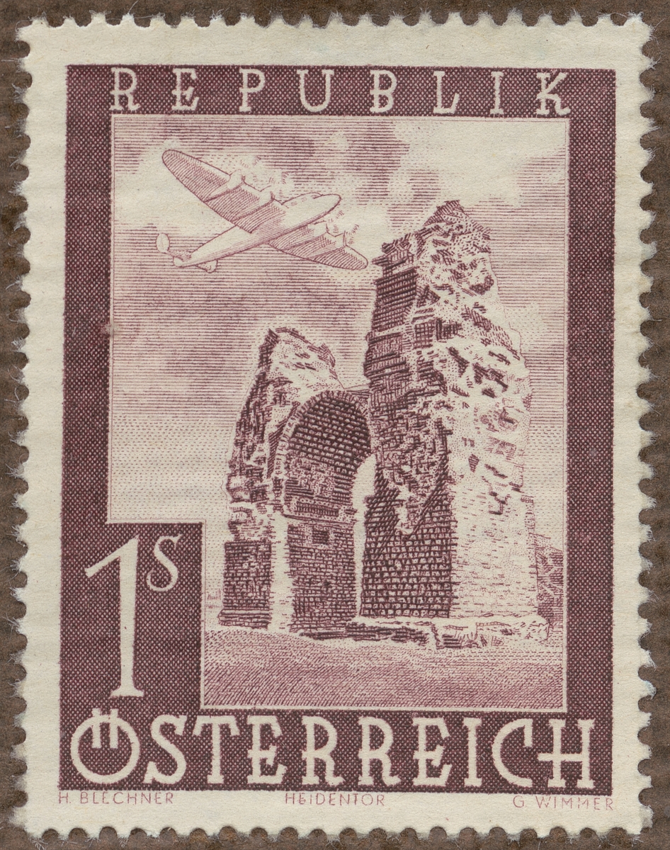 Frimärke från Österrike, 1947. Motiv av fyrmotorigt Monoplan över Ruinerna av romersk triumfport, Carnuntum.