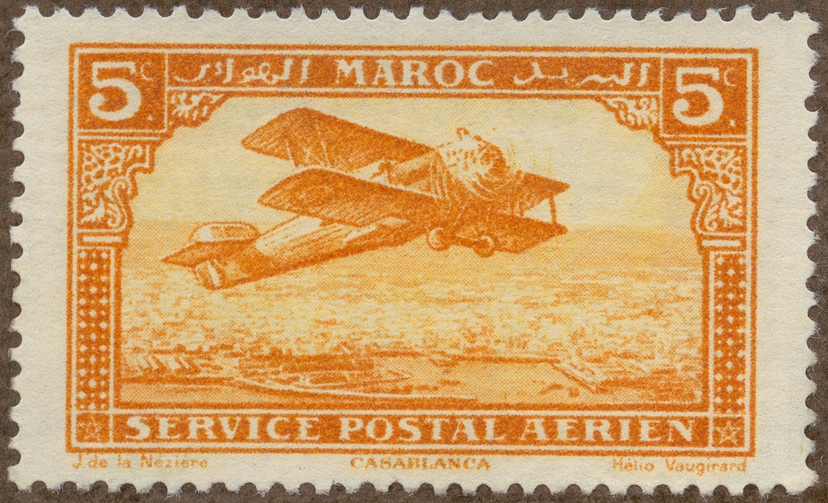 Frimärke från Franska Marocko, 1922. Motiv av Enmotorigt Biplan över staden Casablanca.