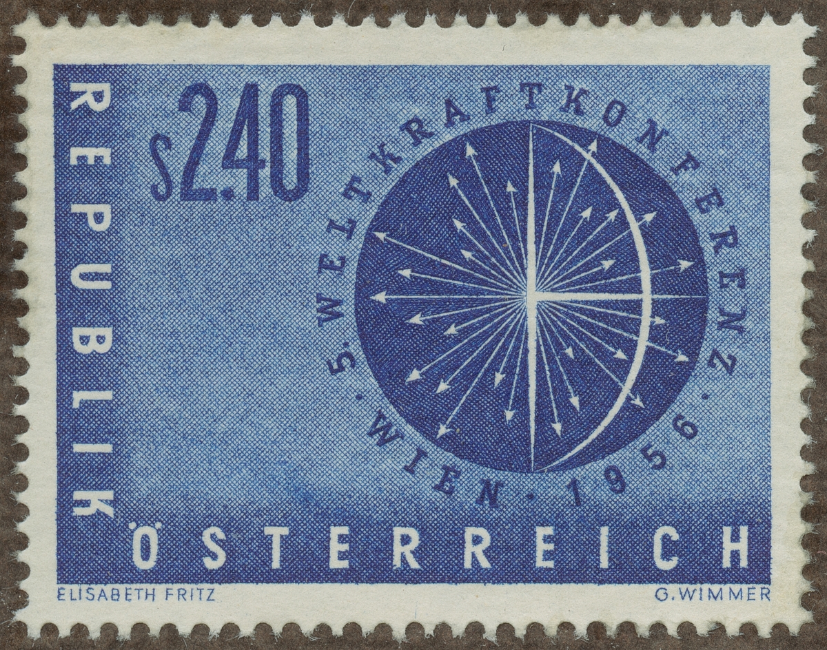 Frimärke från Österrike, 1956. Motiv av Symbolisk strålningsbild 4-de världskraftkonferensen i Wien 1956