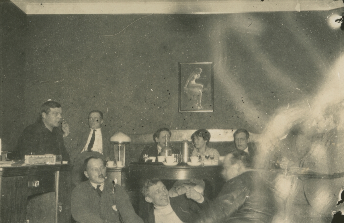Fotografi från expedition till Spetsbergen. Motiv av ett antal män och en kvinna som umgås inomhus. Några sitter i soffa, andra på golvet. På bilden syns kaffekoppar, vinglas, tavla och lampa.
