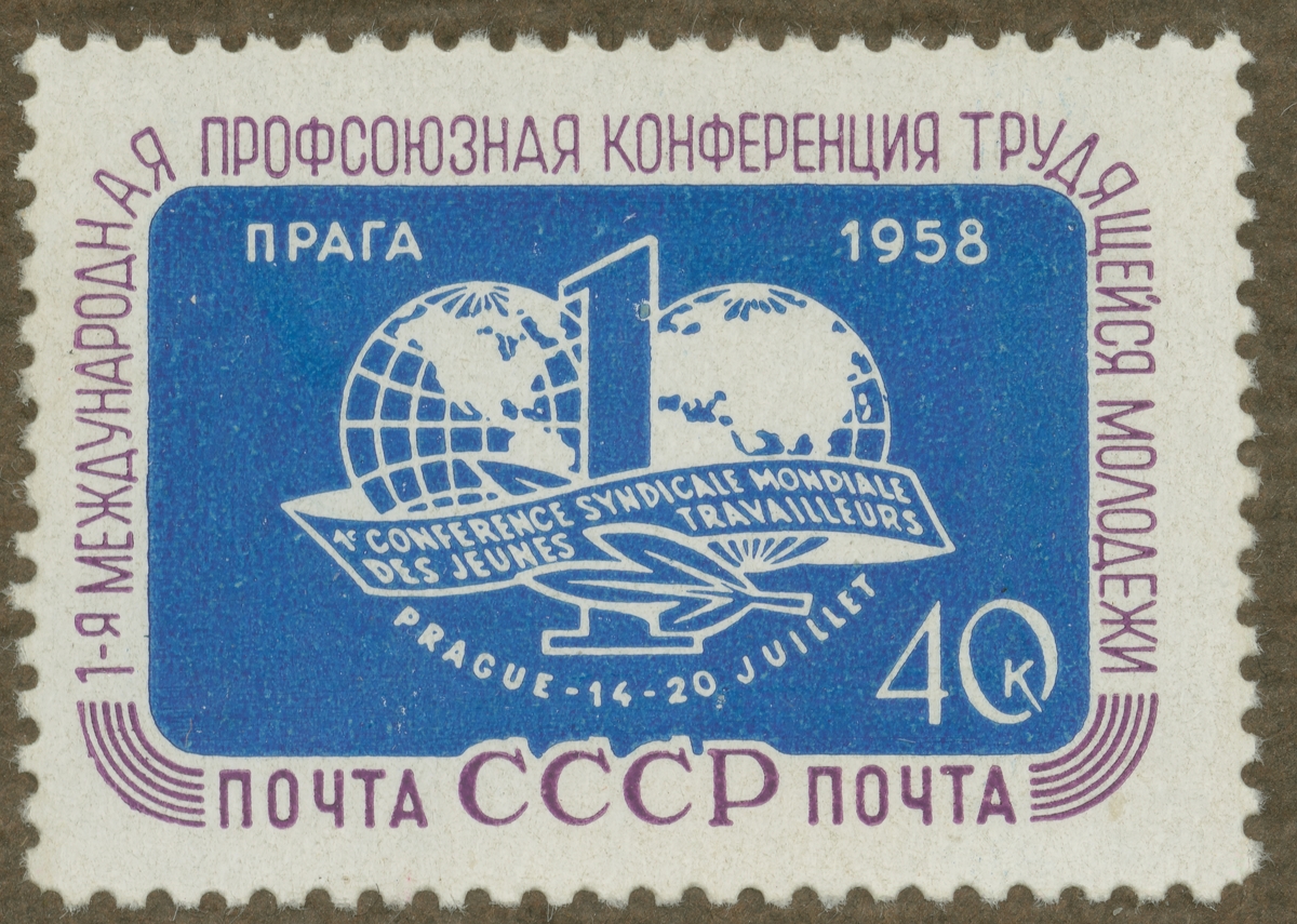 Frimärke från Ryssland, 1958. Motiv av två jordglober. "Världskongress för arbetare i Praga 14-20 juli".