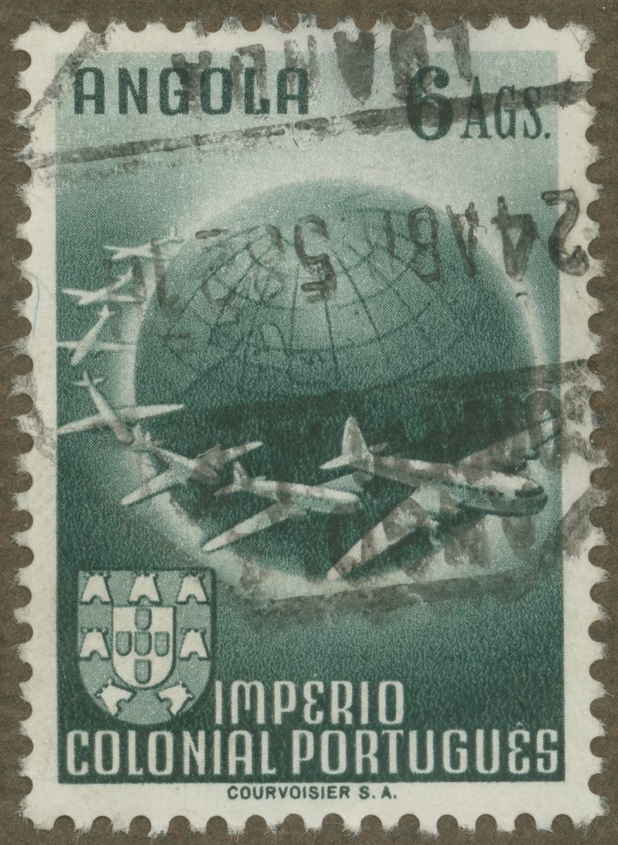 Frimärke från Angola, 1949. Motiv av jordglob omsvärmad av monoplan. "Instituto de Investigaco de Angola".