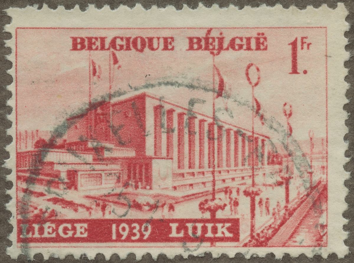 Frimärke från Belgien, 1938. Motiv av Huvudbyggnaden vid den internationella utställningen i Liége. 1939.
