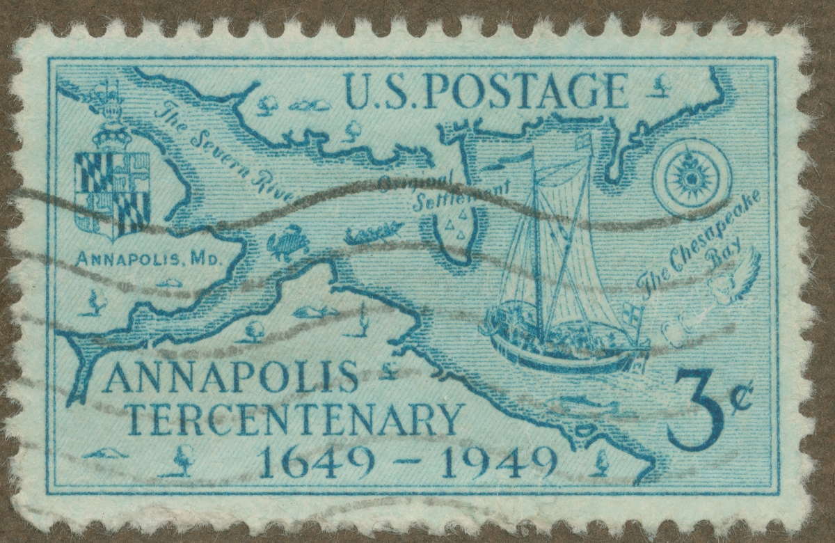 Frimärke från USA, 1949. Motiv av karta från 1600-talet visande staten Maryland med staden Annapolis. "300-årsminne av Annapolis grundande 1649-1949".