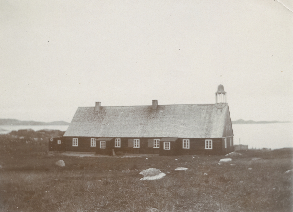 Fotografi från expedition till Grönland. Motiv av träkyrka belägen invid havet. Kyrkan är avlång med nio fönster på ena långsidan och två skorstenar på taket. På taket längst fram sitter ett litet kyrktorn.