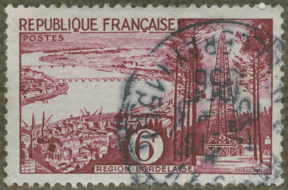 Frimärke från Frankrike, 1956. Motiv av Floden Garonne med broar kring Bordeaux, med radiotorn.
