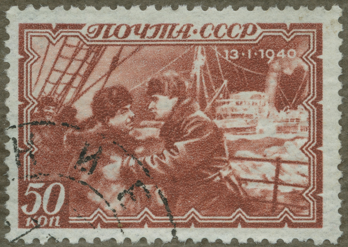 Frimärke från Ryssland, 1940. Motiv av Två isbrytare mötas: (t.v.): Kapten K.S. Badygin från Isbrytaren: "Georg Sedov" (t.h.): Överstyrman Ivan Papanin från Isbrytaren "Josef Stalin".