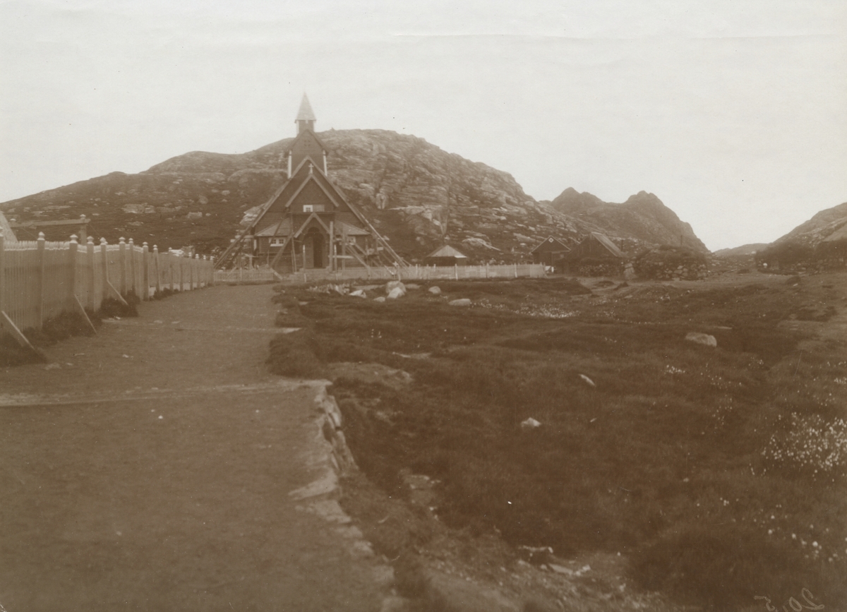 Fotografi från expedition till Grönland. Motiv av träkyrka belägen vid en väg framför ett berg. Vid sidan av vägen går ett trästaket.