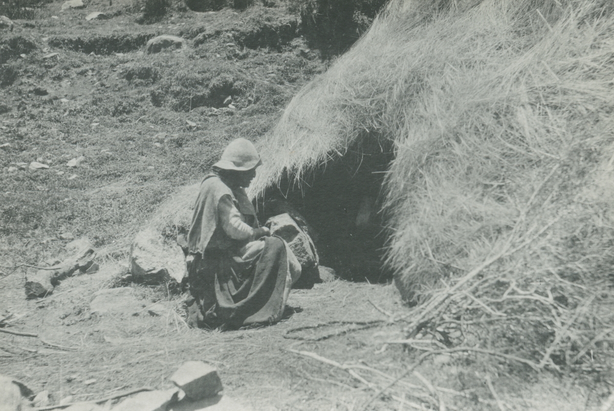 Fotografi från expedition till Peru 1920. Motiv av kvinna som sitter vid ingången till en hydda med halmtak.