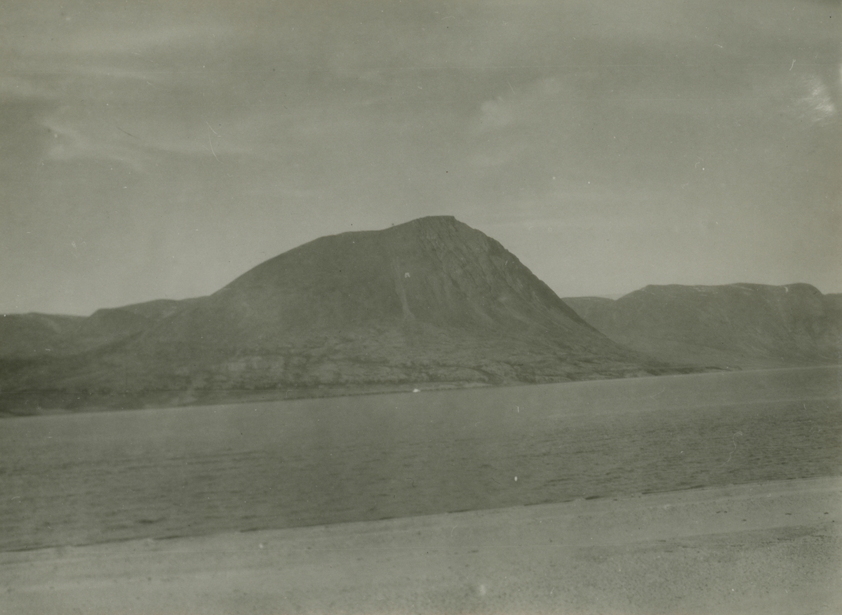 Fotografi från expedition till Östgrönland 1929. Dansk-svensk expedition under ledning av Lauge Koch. Svenska deltagare: Oscar Kulling och Helge Backlund. Vy över bergslandskap och himmel.
