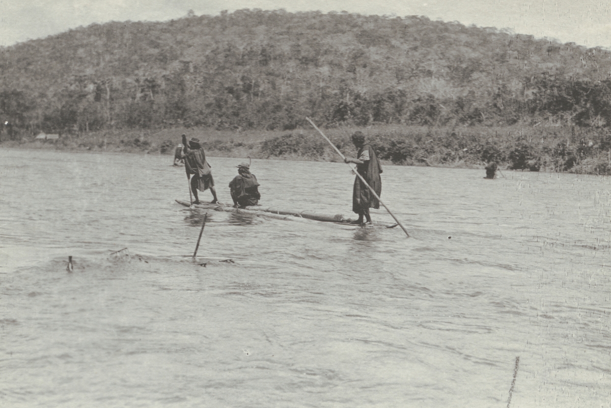 Fotografi från kuvert märkt med "Ernst Nordenskjöld". Motiv av tre män på en flotte i flod i djungeln.