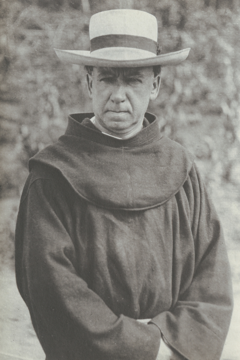 Fotografi från kuvert märkt med "Ernst Nordenskjöld". Porträtt av expeditionsdeltagare iklädd hatt och munkkåpa.