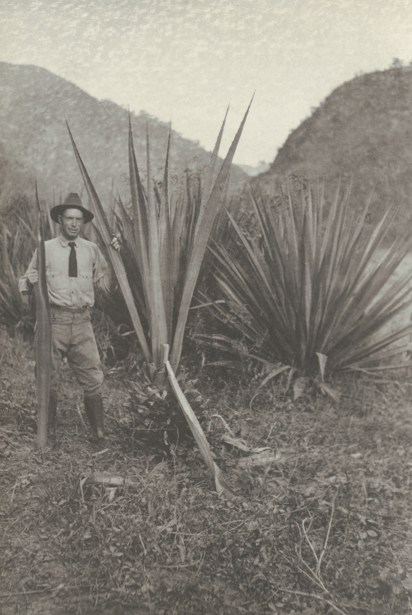 Fotografi från kuvert märkt med "Ernst Nordenskjöld". Motiv av upptäcktsresande som poserar vid stor agaveplanta i djungeln.