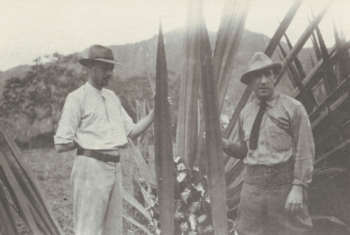 Fotografi från kuvert märkt med "Ernst Nordenskjöld". Motiv av två expeditionsdeltagare som poserar vid stor agaveplantai djungeln.