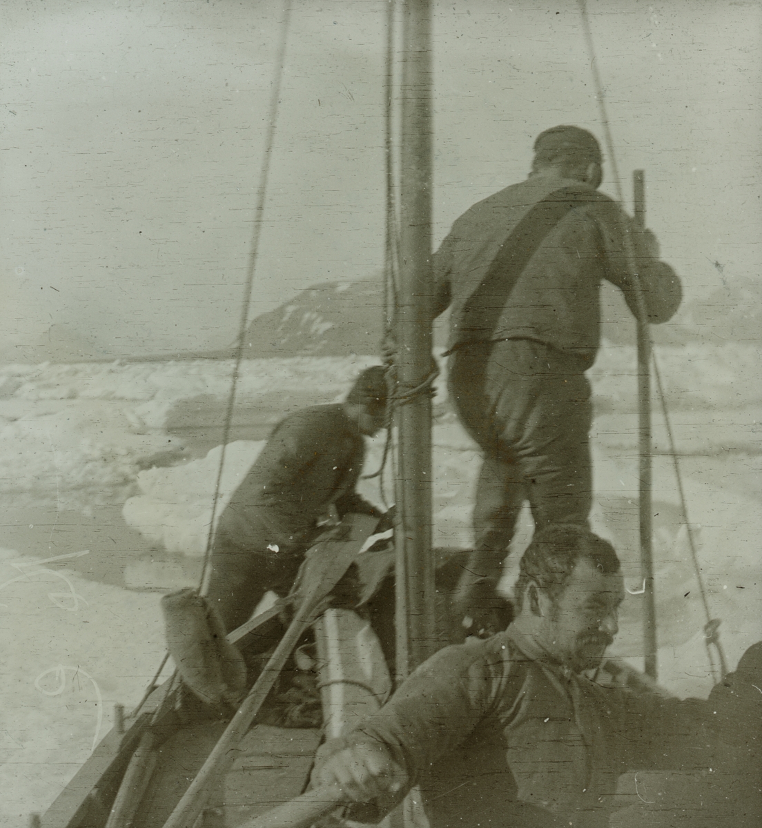 Fotografi från expedition till Spetsbergen. Motiv av män på båt bland isflak.