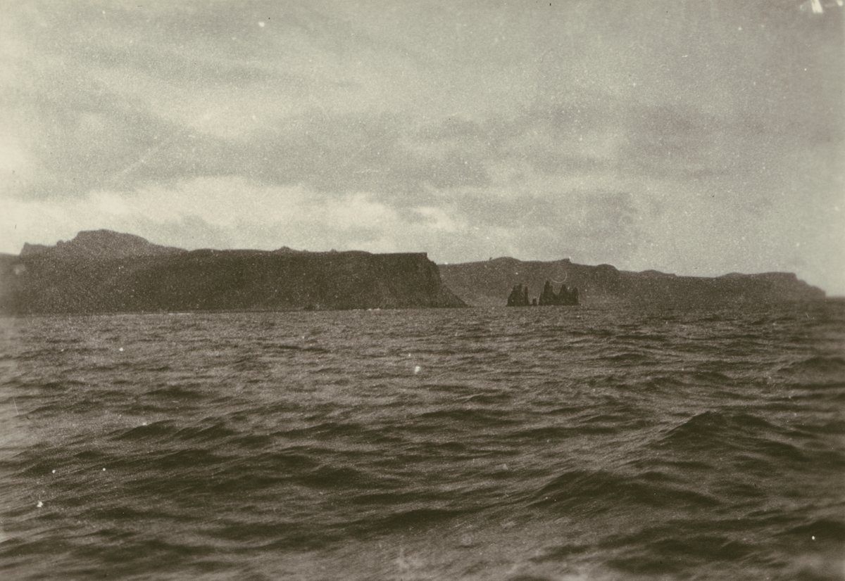 Fotografi från Albin Ahrenbergs resa till Grönland 1929. Vy över hav och berg på Islands sydkust.
