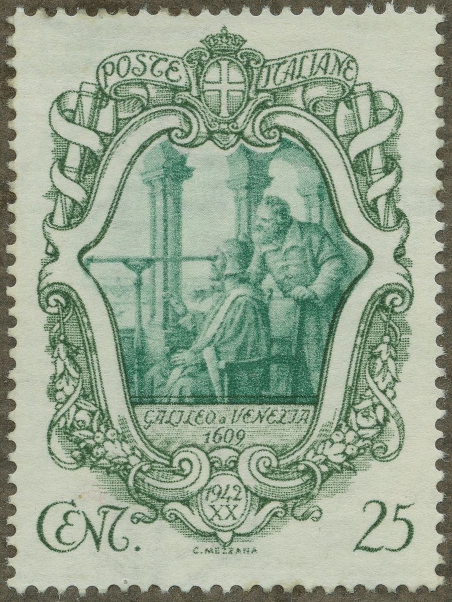 Frimärke från Italien, 1942. Motiv av Galileo Galilei med kikare i Venedig 1609. "300-årsminne av Galilei död. 1642-1942."