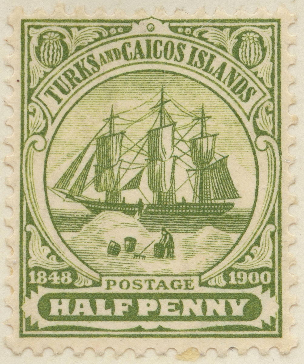 Frimärke från Turks och Caicos Öarna, 1900. Motiv av Fullriggare: Öarna Turks och Caicos:s vapen.