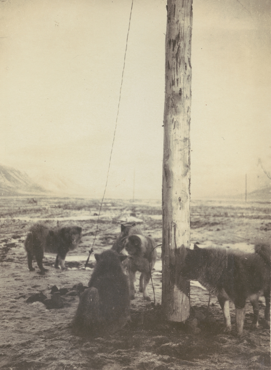 Fotografi från expedition till Sveagruvan. Motiv av fyra hundar vid stor träpelare.