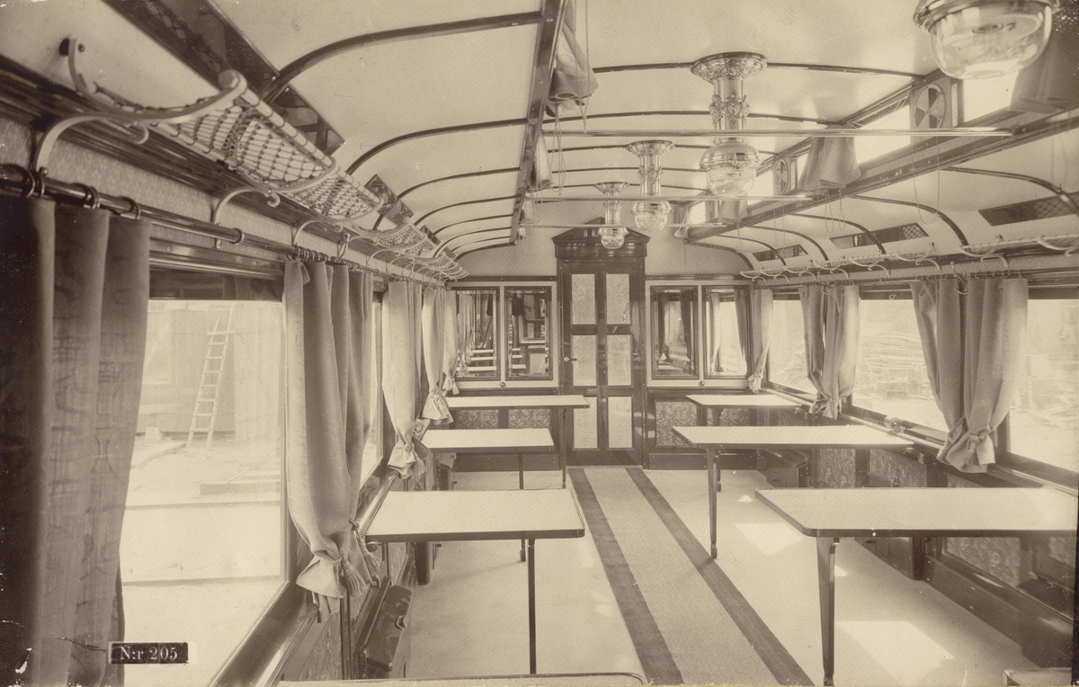 Tågvagn. Matsal i restaurationsvagn. Ur album: Vagnfabriks Aktiebolaget i Södertälge.