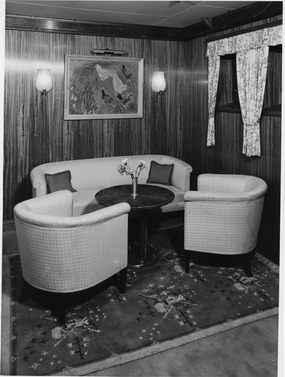 Salong i lyxhytt ombord på fartyget Stella Polarism vid Svenska Amerika Linien. Flossmattan på golvet är tillverkad av Agda i Göteborg.