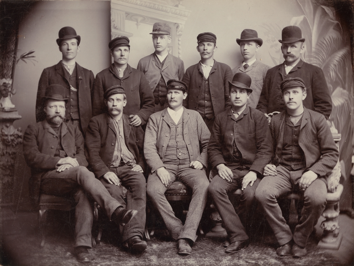Anställda vid Österby Bruk. Övre raden: Hägg, Friberg, Gumaelius, Berglund, Johansson, Eklöf. Nedre raden: Hedell, Gamuelson, Berggren, Hederquist och Englund.