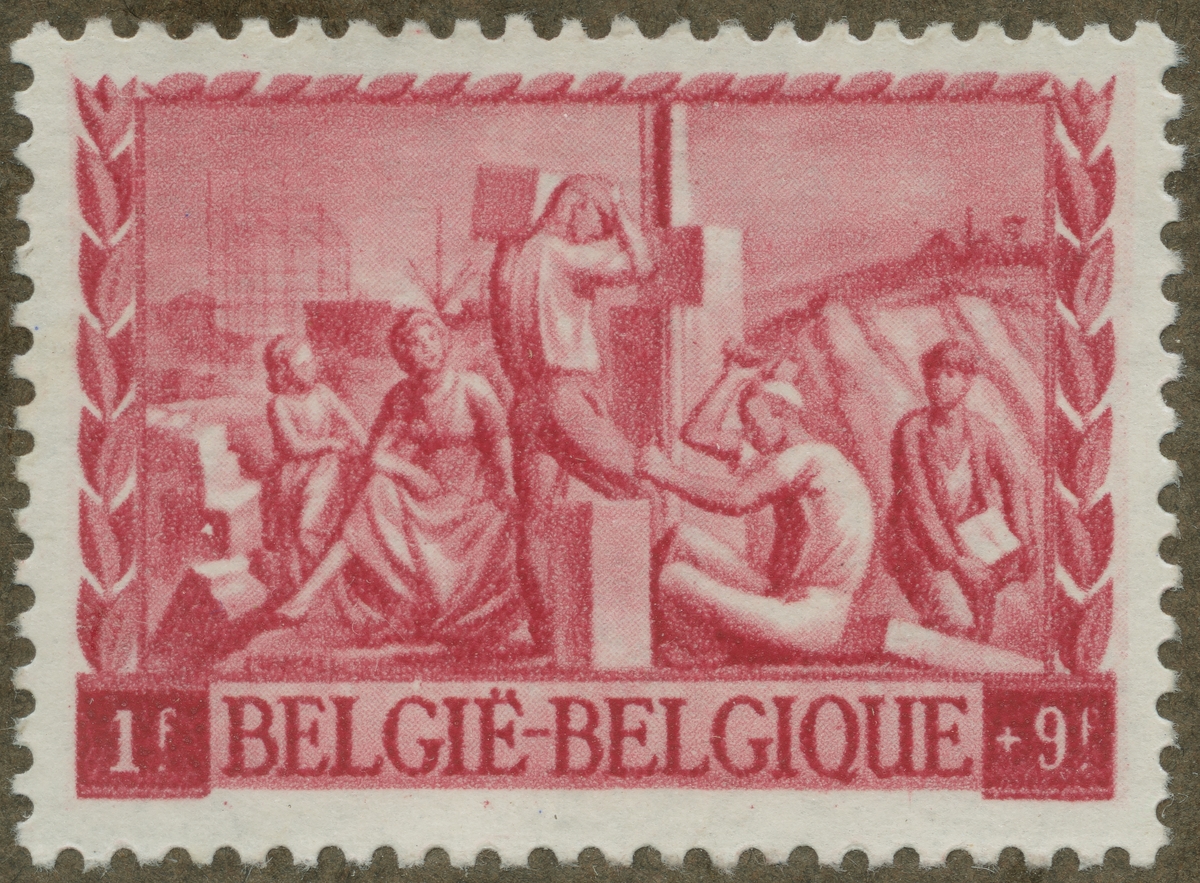Frimärke från Belgien, 1945. Motiv av gemensamt återbyggnadsarbete av Valloner och Flamländare, Världskrig II. "Serie till förmån för krigsoffer".