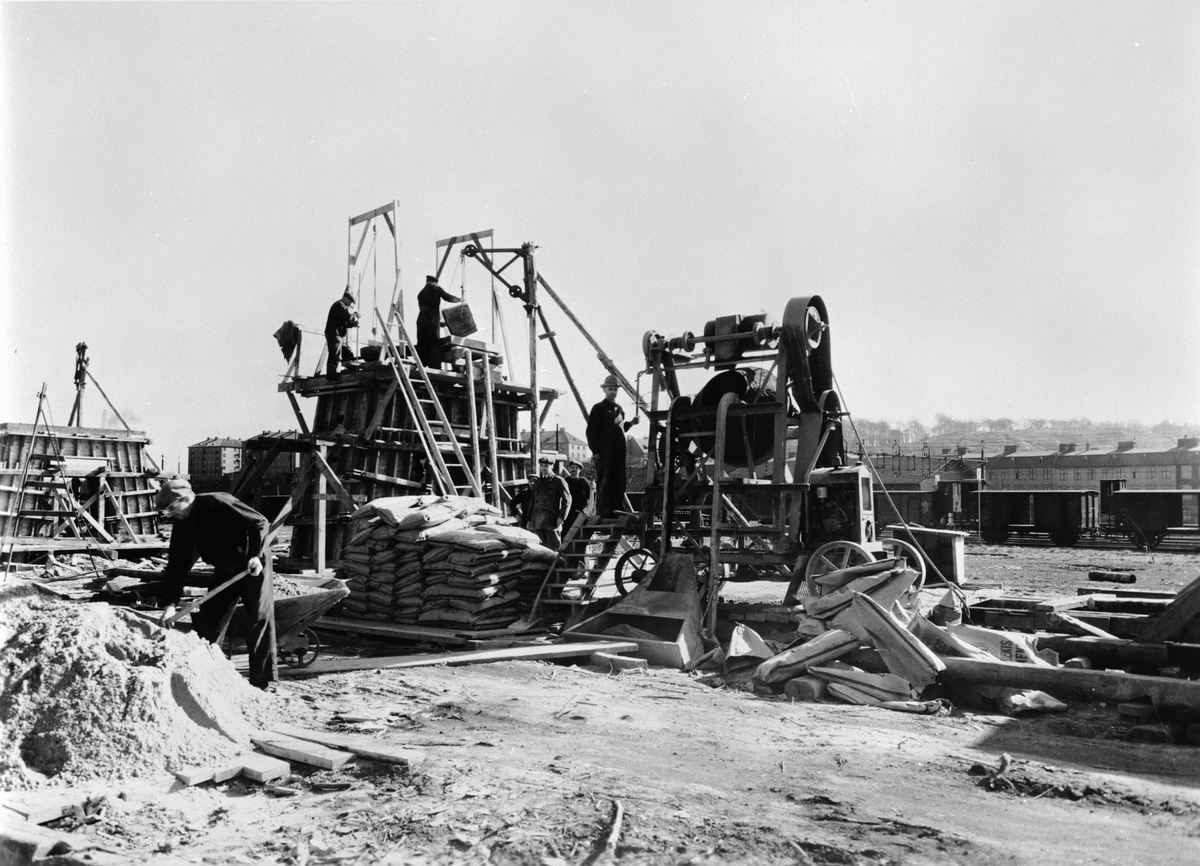 Byggherre: Byggnadsaktiebolaget Contractor, Stockholm. Gjutning av pelare för SJ:s viadukt.