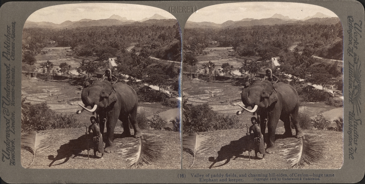 Stereobild av tam elefant med sina två skötare, Valley of the paddy fields, Ceylon.