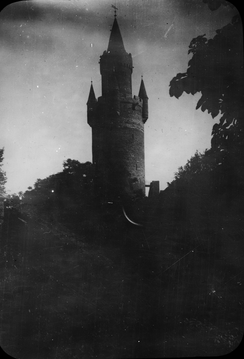 Skioptikonbild med motiv av torn i slottet i Friedberg.