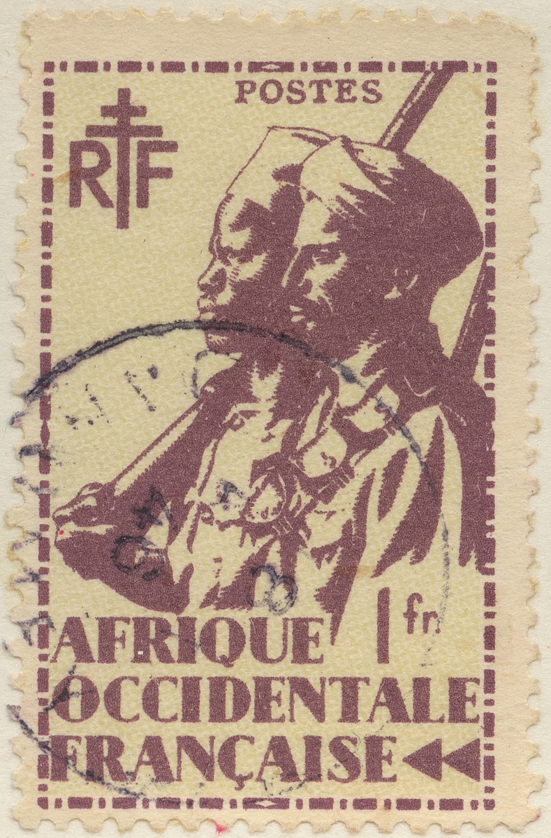Frimärke från Franska Väst Afrika, 1945. Motiv av krigare
