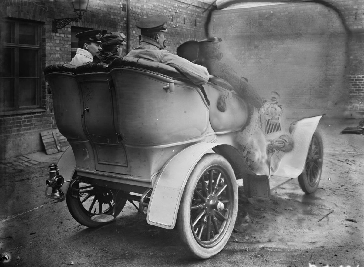Automobil med passagerare utanför Gustaf LM Ericssons Automobilfabrik.