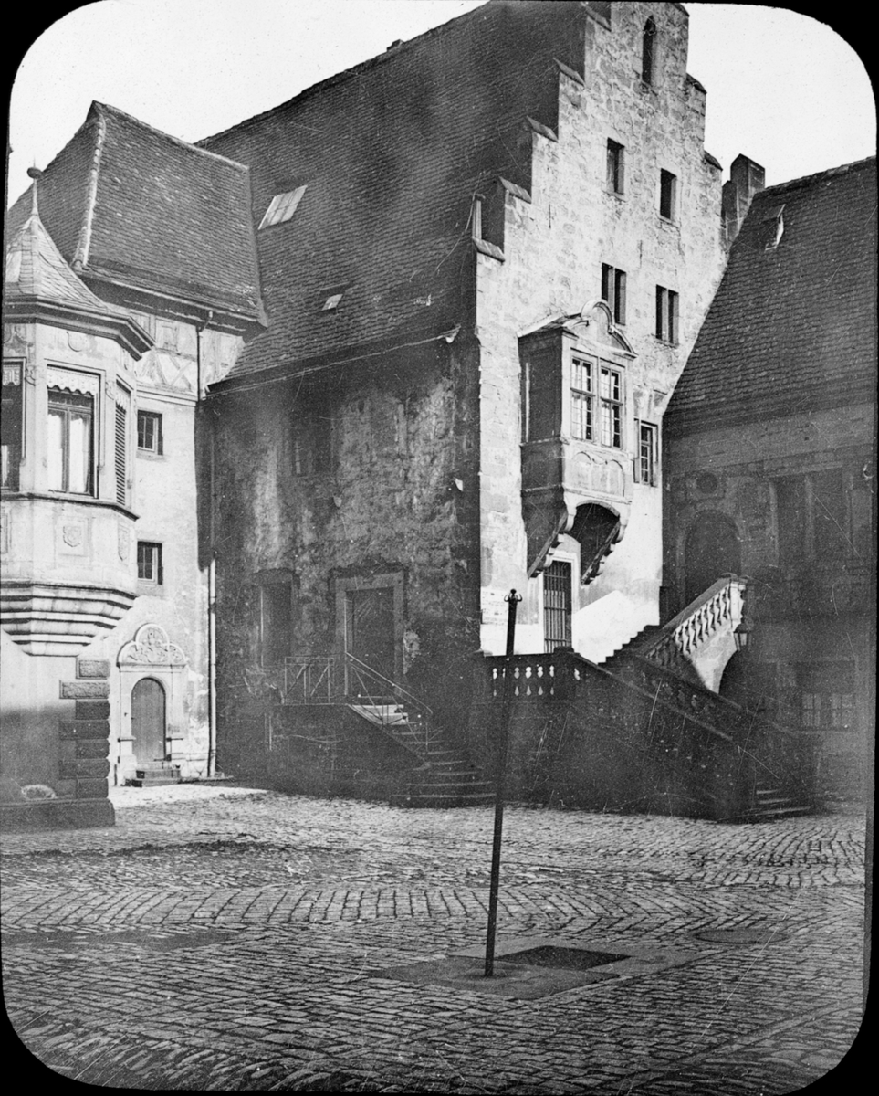 Skioptikonbild med motiv av typiskt tyskt hus i Heilbronn.