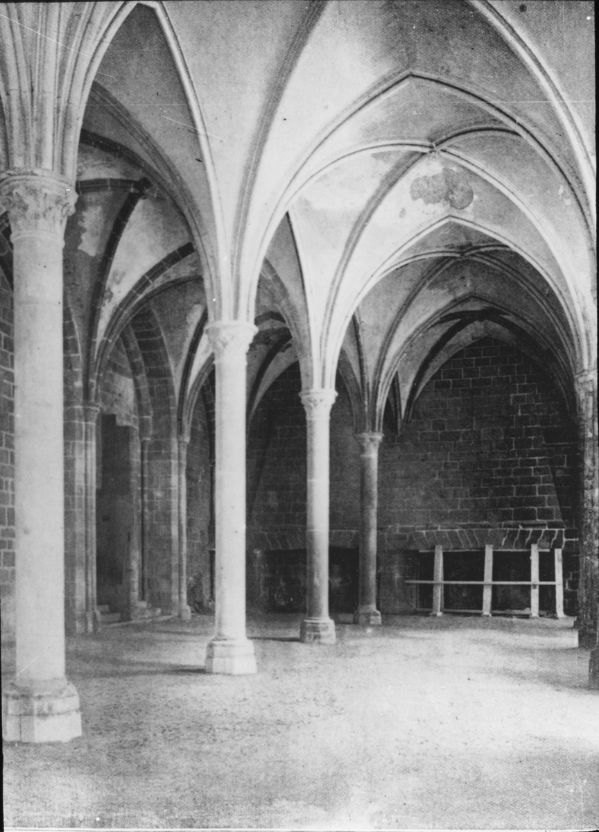 Bilden har förvarats i kartong märkt: Resan1908 XIV. St. Michel 7. Dinan 1.. Text på bild: "Abbaye du Mont St. Michel, Le Réfectoire".