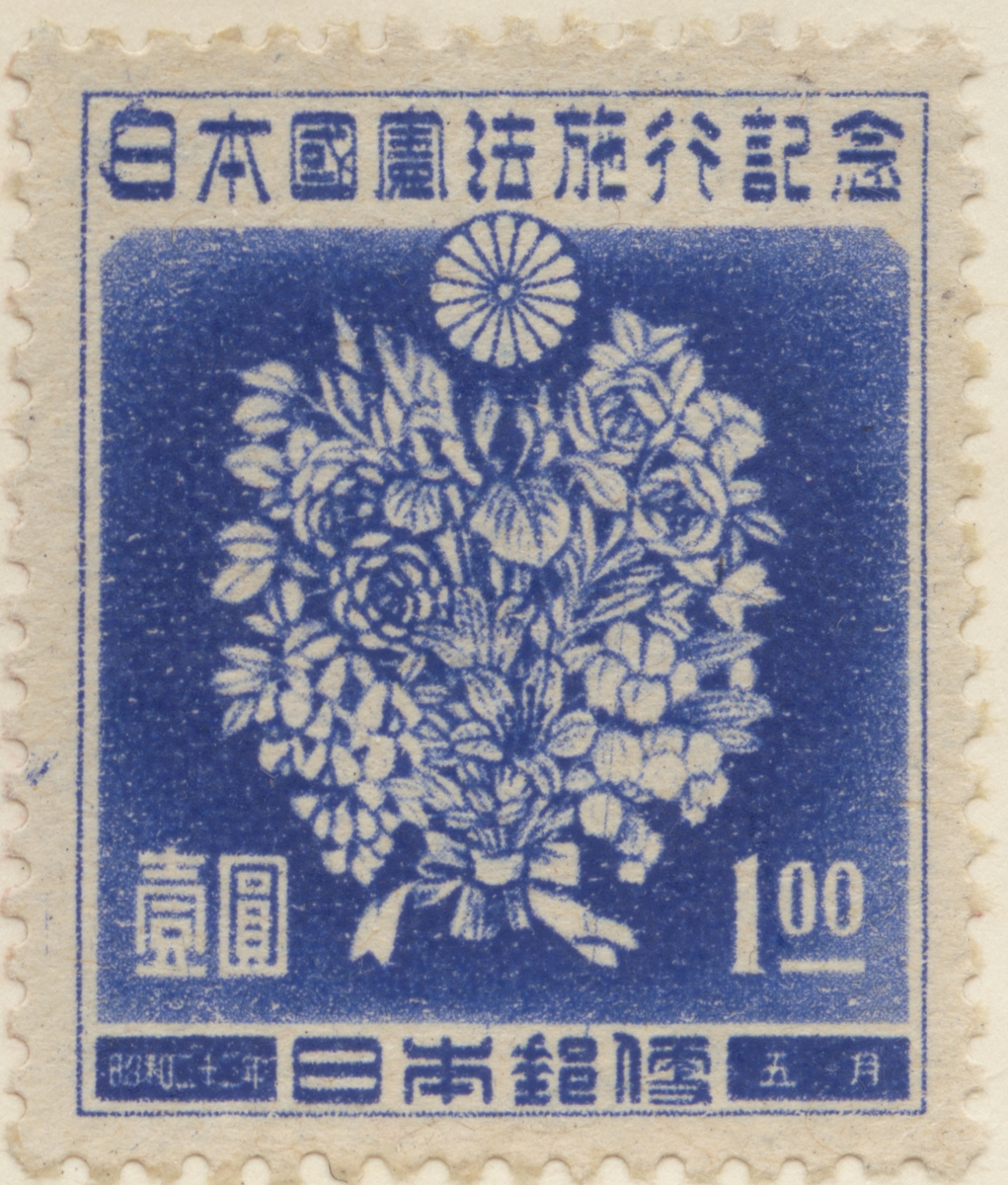 Frimärke från Japan, 1947. Motiv av bukett av japanska majblommor. "Minne av ny japansk författing 3 maj 1947".