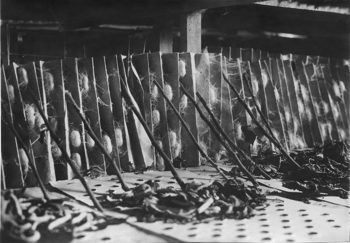 Silkesframställning i Sanssouci, Potsdam. Silkesmaskar och kokonger.