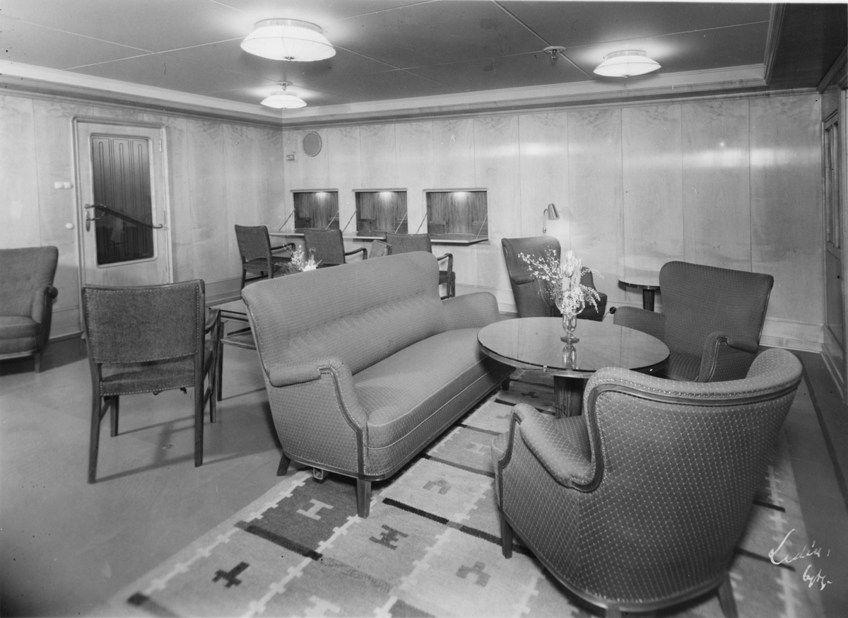 Turistklass skrivrum ombord på M/S 611 Stockholm vid Svenska Amerika Linien. Inredningen utförd av Götaverken. Panel: Sykomor. Tak: vitmålat. Gardiner: Grön-brun-gul-randiga. Möbelklädsel: Ljust grönt och brunt. Matta: Röd-gul-rutig.