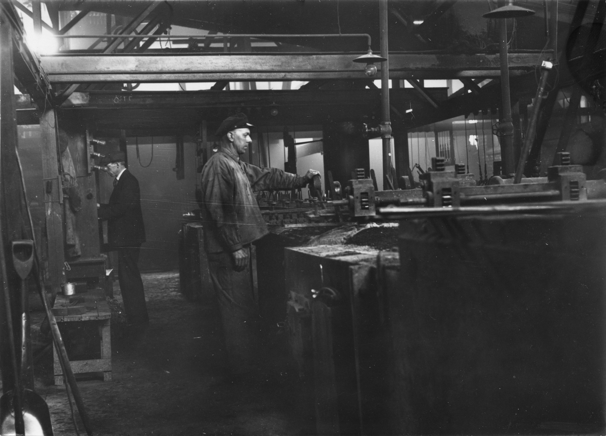 Munkfors Bruk i Värmland. Härdverket 1930. Smältning av smala band.