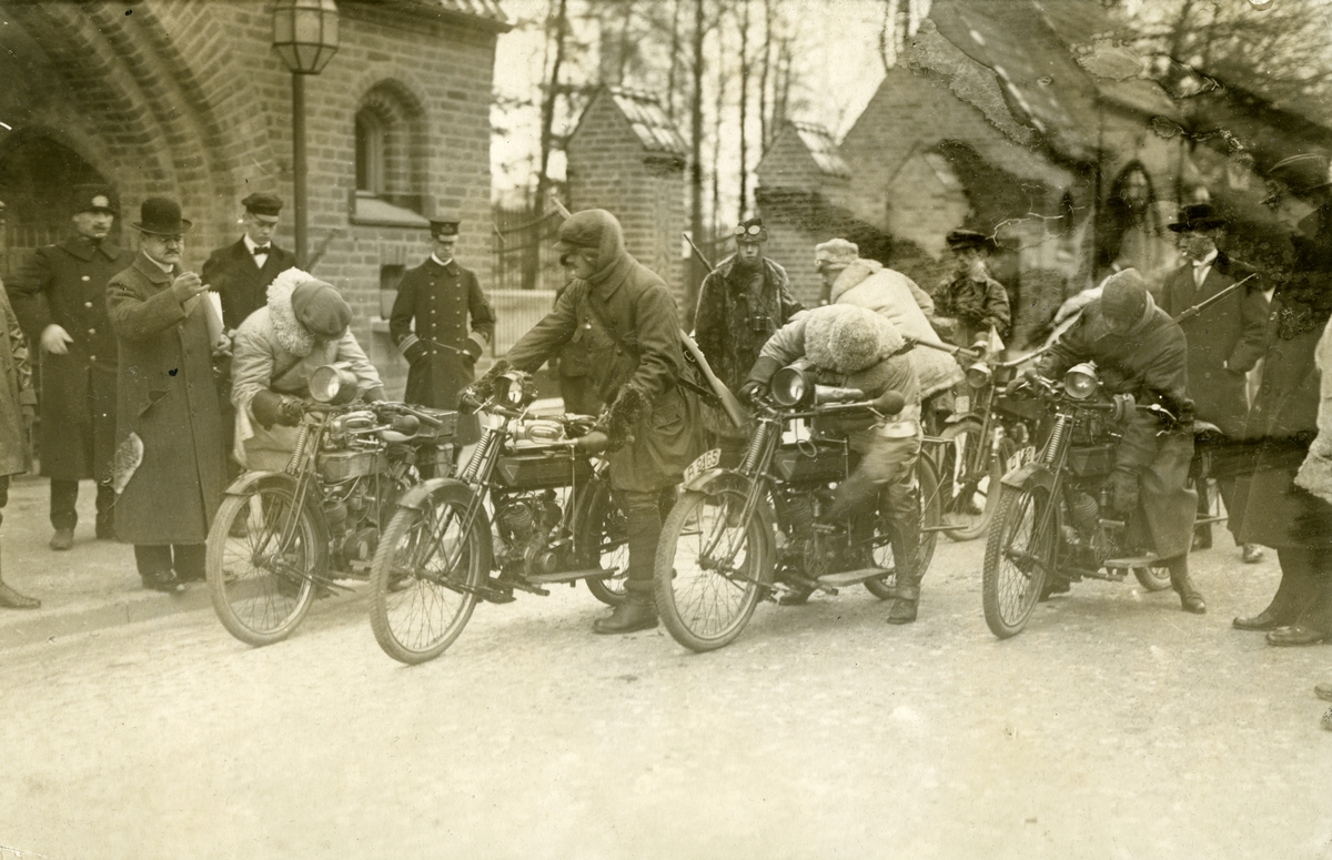 Motorcykeltävling utanför Stockholms Stadion. Motorcykeln av fabrikatet Royal Enfield med nummer A2165 registrerades år 1913 på löjtnanten Patrik Welin, Stockholm