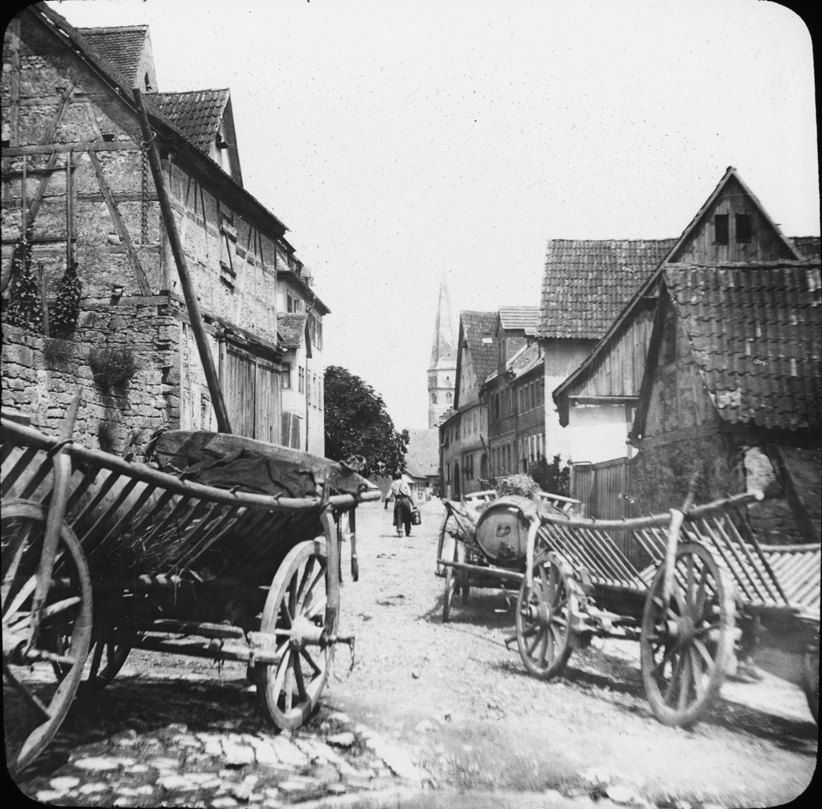 Skioptikonbild med motiv av gatuvy från Münnerstadt. St Maria Magdalena Kirche i bakgrunden.