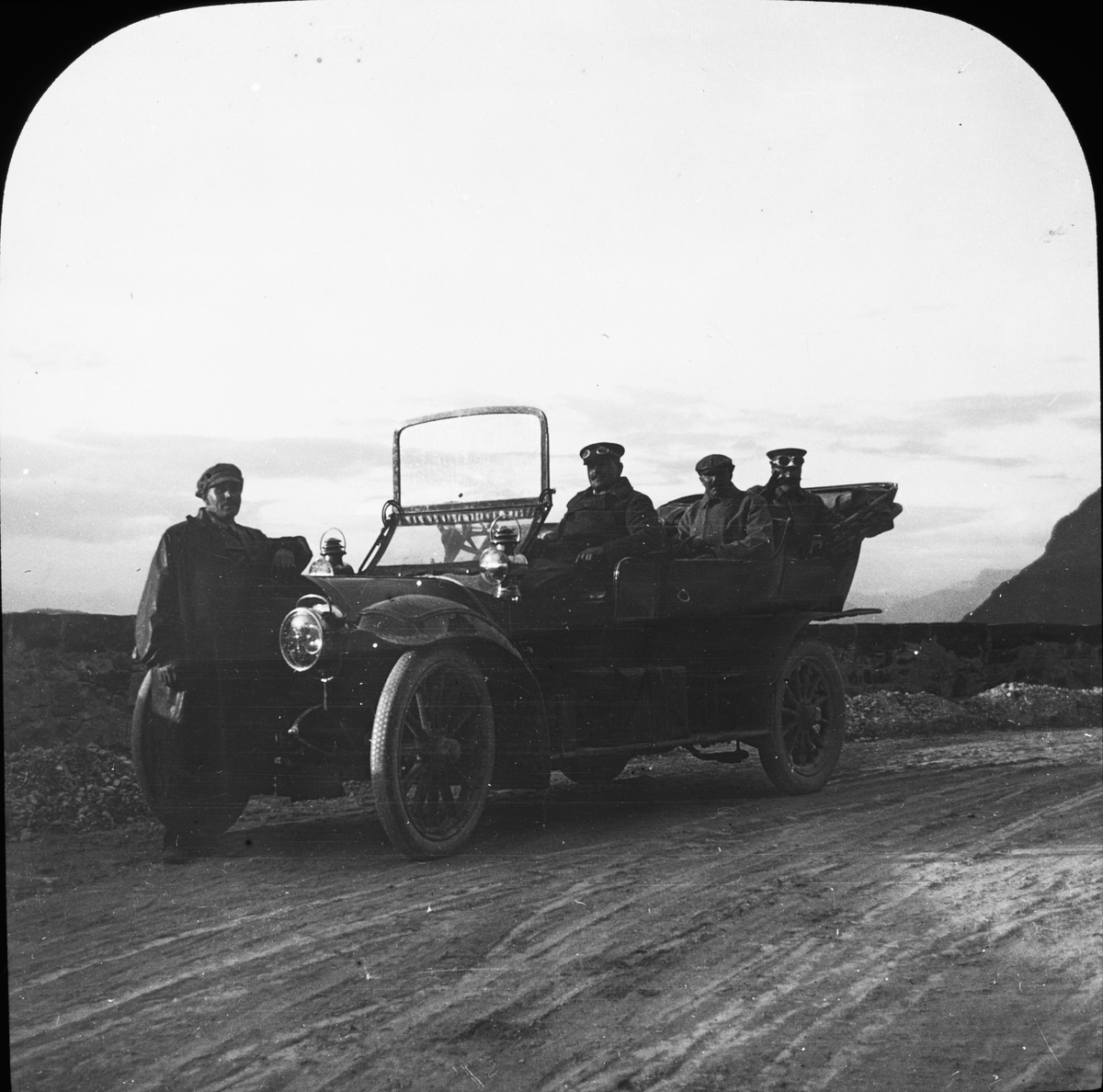 Skioptikonbild med motiv av resesällskap på landsvägen kring sjön Königssee.