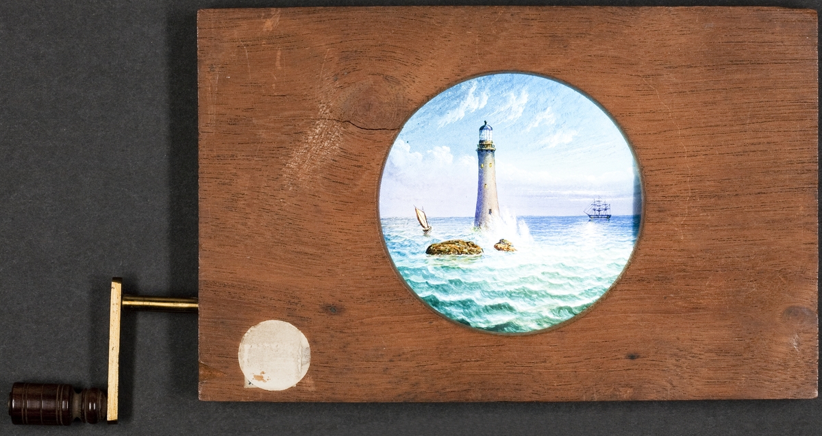 Ljusbild för laterna magica med motiv av skepp vid fyr, vågor i rörelse.