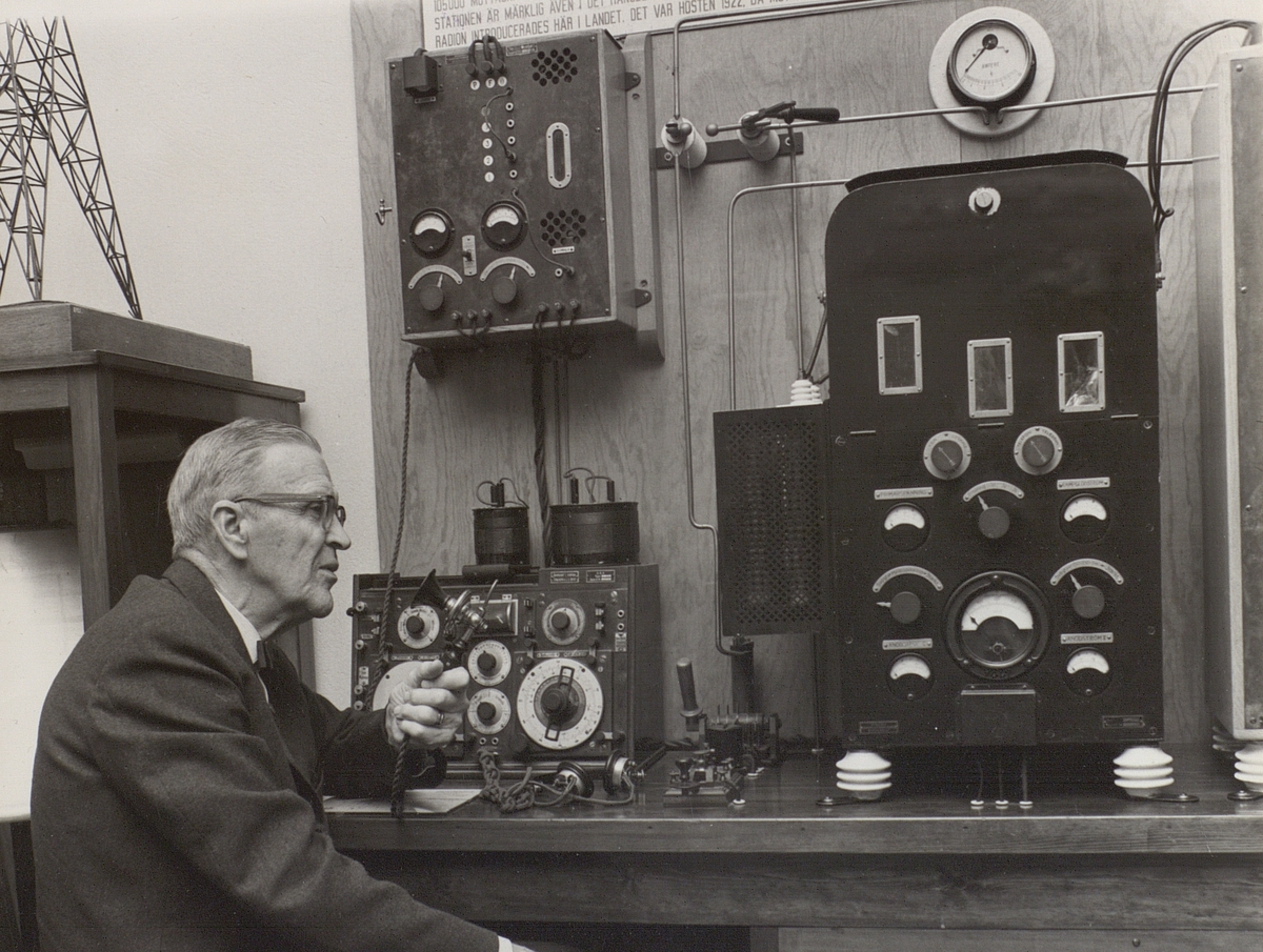 Einar Malmgren var hallåman vid de första försöken med rundradio 1922 på telegrafverkets undervisningsanstalt. Rörsändare från Svenska Radioaktiebolaget.
