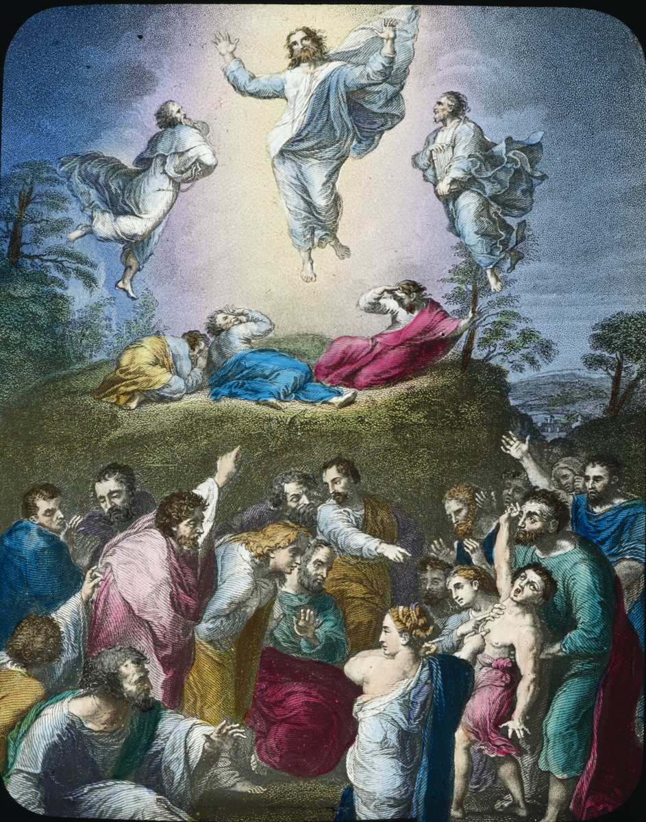 Kolorerad skioptikonbild med religiöst motiv. Jesu uppståndelse.