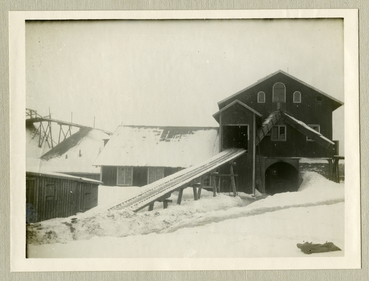 Källfallsgruvans skrädhus med upplag av anrikningsgod 1921.