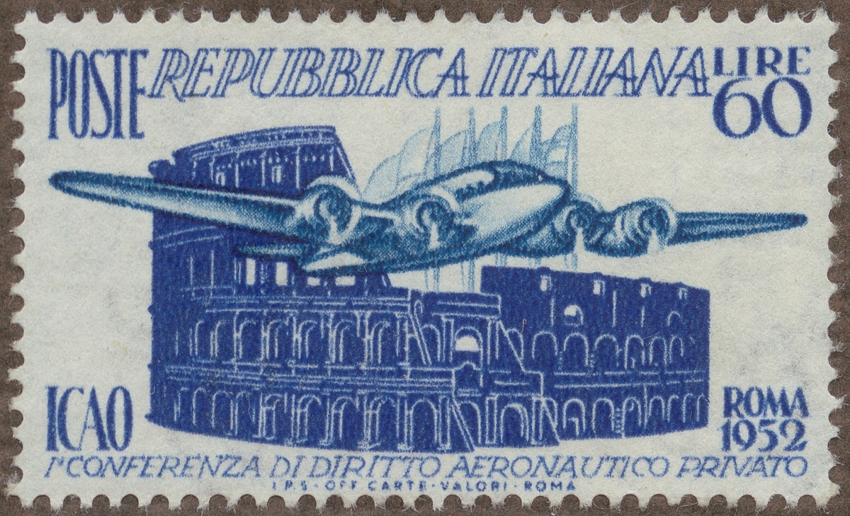 Frimärke från Italien, 1952. Motiv av Fyrmotorigt flygplan över Colosseum i Rom "Aeronautisk kongress i Rom 1952-